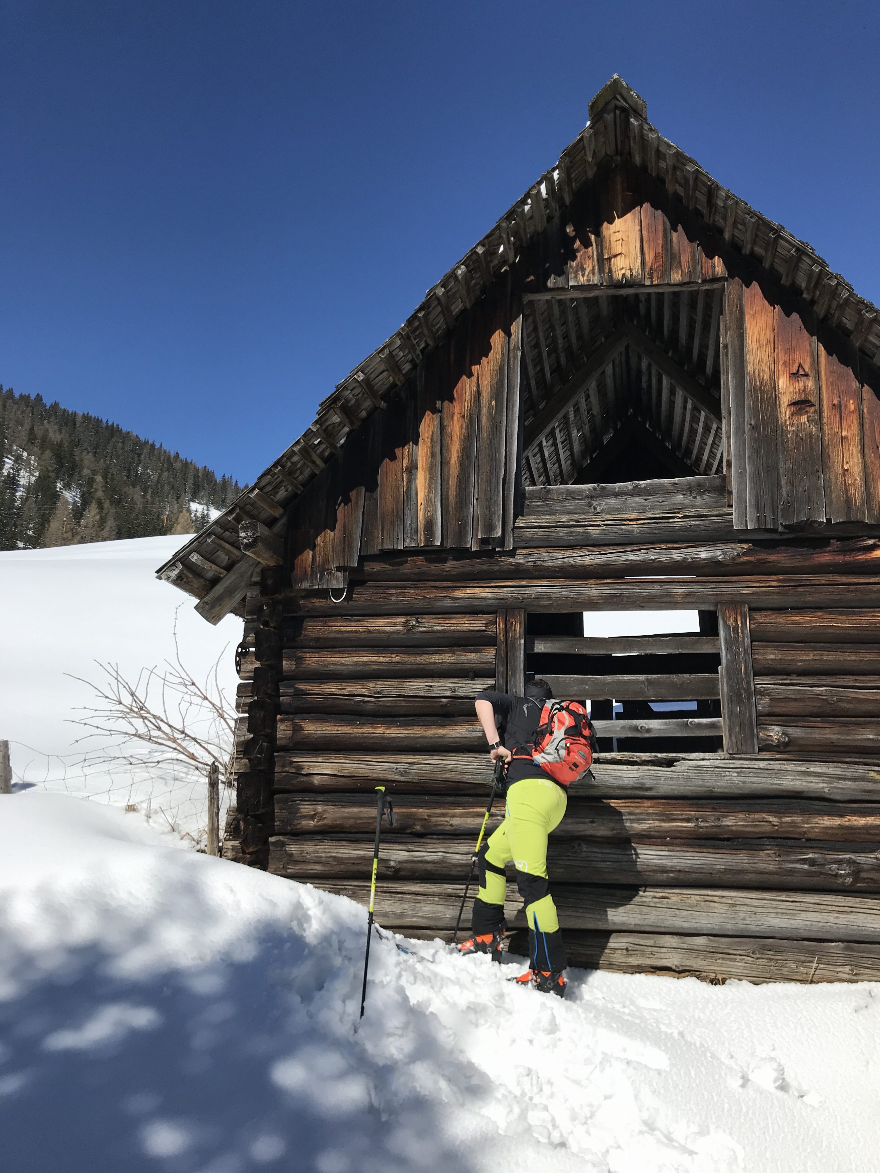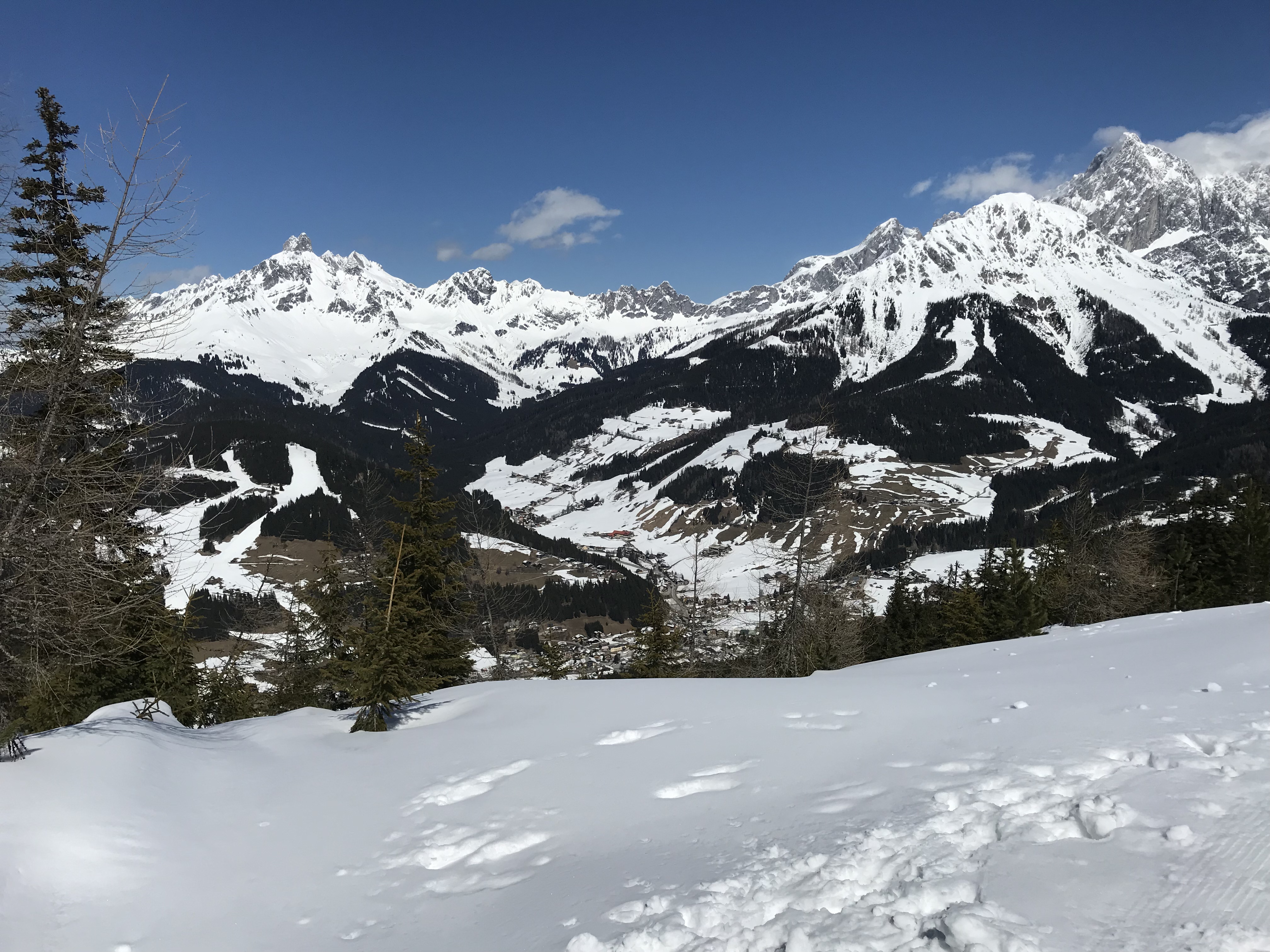 Finally back in Ramsau, we went for a quiet little backcountry tour up Rittis. Quiet because we were the only ones going up there. The lift was already closed a couple of days ago and most of the tourists have left Ramsau. So we went up there to have a small lunch at the peak of the Rittis. From there you have a fantastic panoramic view onto the mountains around. For the way down we took the alpine skiing slopes, which have not been groomed since the last skiing day of the season. This was so much fun. We almost decided to go up there one more time right away 😉