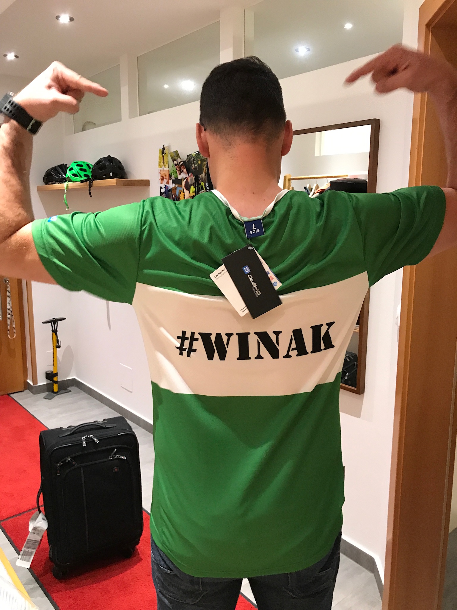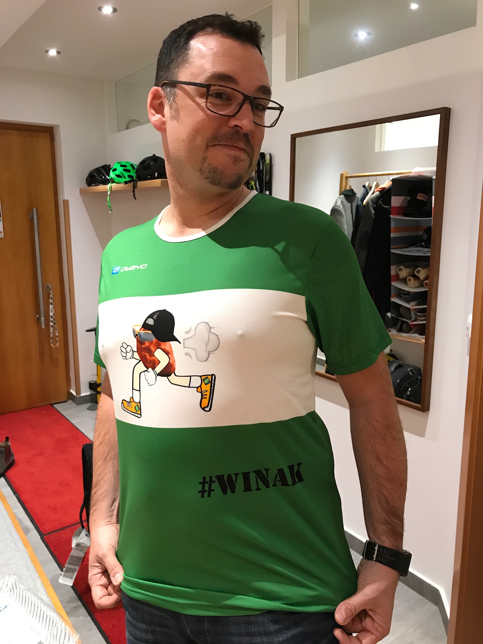 Now the only discussion was about the team name. After a few sips of wine on both sides of the phone the team name was found: #WINAK (wenn i nur aufhör’n könnt). This is the advertising slogan for a very popular Austrian candy called Dragee Keksi. Next thing on the list was the design of the logo for the team jersey. Since we were not allowed to use the candy bags due to copyright issues, we had to design our own and here it is: