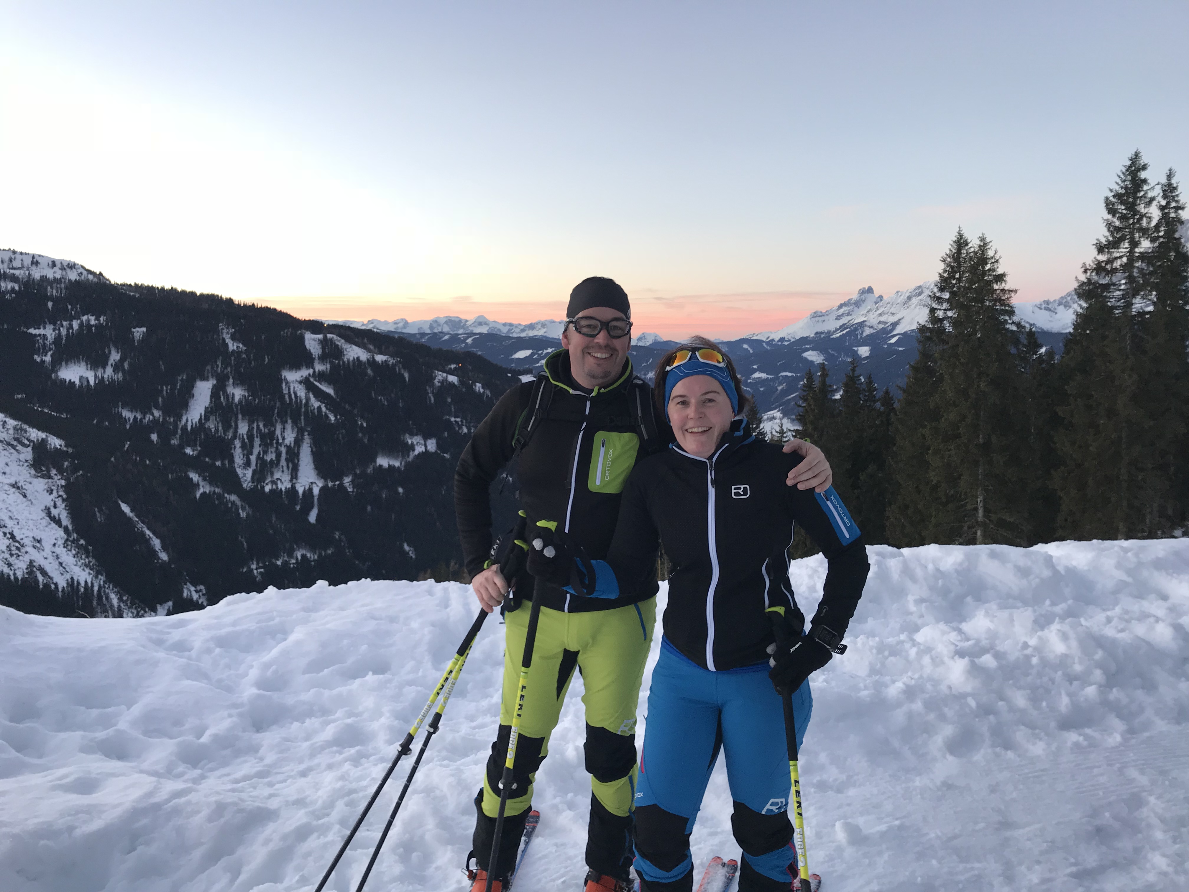 The next day we new we had to step up our training to get rid of more calories taken in during the last few days. So we did a Cross Country session in the morning and a longer Back Country tour in the evening. The latter we combined with a family gathering on top of the Mountain Hochwurzen with Christine, Hans, Florian, Mojca and Felix. While we skied down afterwards the others sledded down.